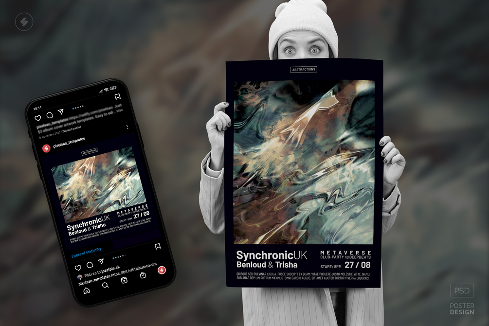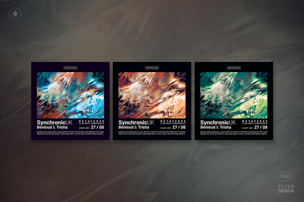 Liquid abstract design, event poster, and square party flyer Photoshop PSD template for various events, club music DJ sessions, and electronic music parties. Best for electronic music genres such as liquid funk drum and bass, techno, tech-house, deep house, electro, progressive house, alternative electronica, dubstep, lo-fi, ambient, alternative music, etc.