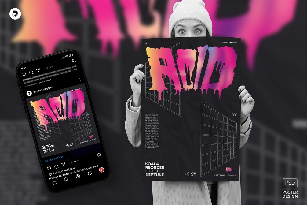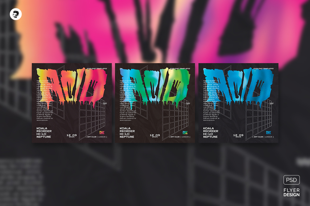 Typographic poster design. Creative party flyer Photoshop PSD template for progressive electronic music DJ parties, or various events. Best for music genres such as acid techno, progressive house, minimal, tech-house, deep house, organic house, rave, electro, liquid funk, drum and bass, dubstep, alternative electronica, lo-fi house, ambient electronica, etc.
