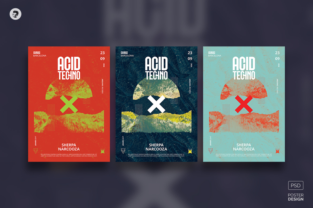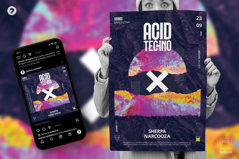Abstract poster design. Creative party flyer Photoshop PSD template for alternative electronic music DJ parties, or various events. Best for music genres such as acid techno, progressive house, minimal, tech-house, deep house, organic house, rave, electro, liquid funk, drum and bass, dubstep, alternative electronica, lo-fi house, ambient electronica, etc.