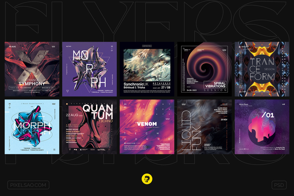 Qty: 1Collection of 10 creative abstract poster/flyer designs. Easy to edit and customize Photoshop PSD templates. Creative A3 posters and square flyers for electronic music parties, club DJ sessions, or various events. Best for alternative electronic music genres such as liquid funk drum and bass, ambient, electronica, techno, tech-house, trance, progressive house, minimal, house music, organic house, deep house, downtempo, lo-fi house, etc.