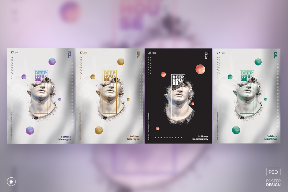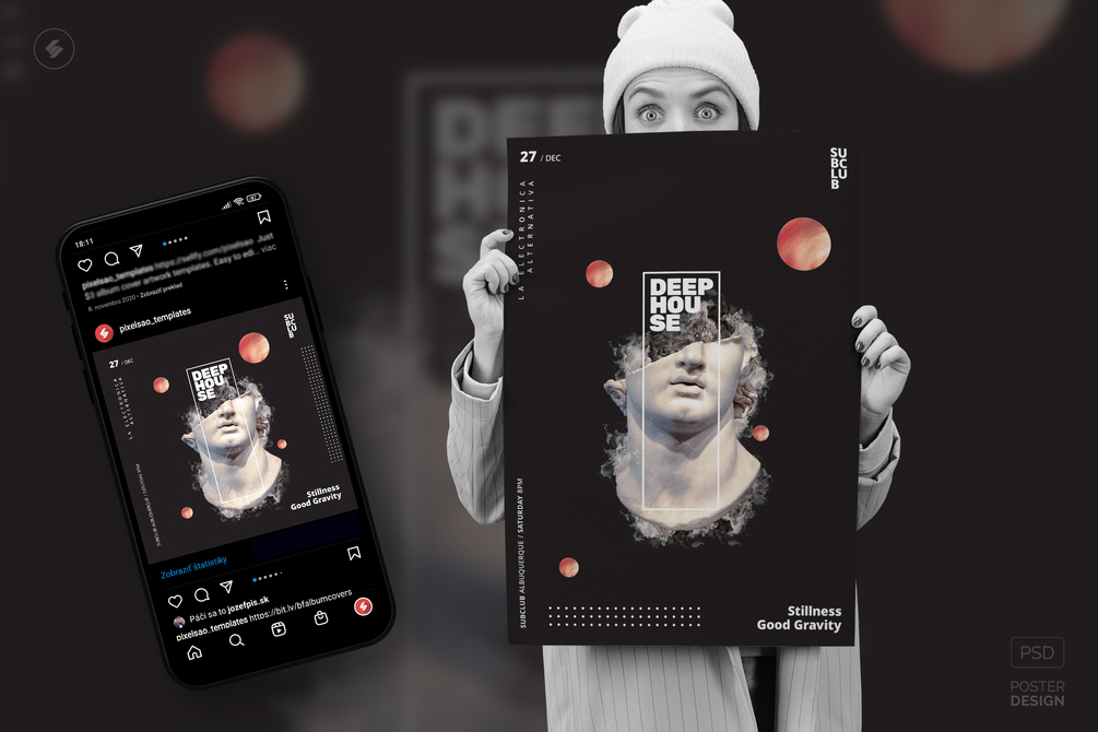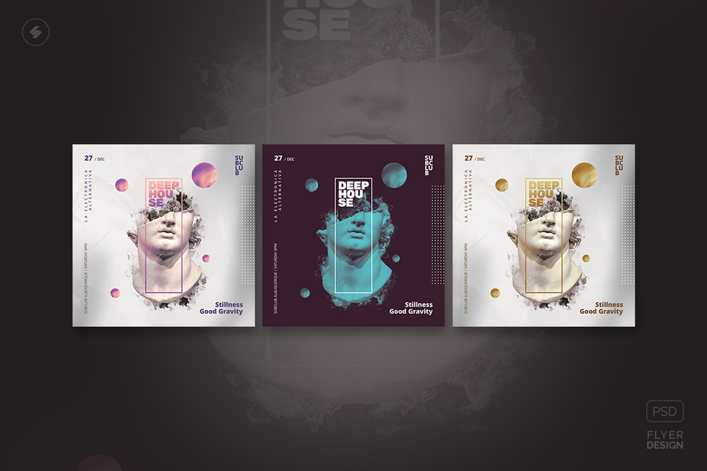 Creative surreal design, minimal event poster, and square party flyer Photoshop PSD template for a concert, club music DJ session, or electronic music dance party. Best for music genres such as deep house, techno, tech-house, minimal, progressive house, electro, alternative electronica, drum and bass, dubstep, trap music, alternative music, etc.