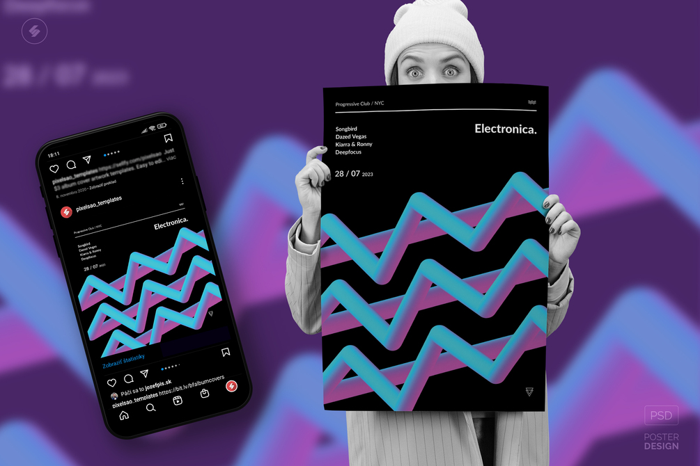 Progressive electronic music session A3 poster, and square party flyer Photoshop PSD template for various events, club music DJ parties, or exhibitions. Best for electronic music genres such as minimal, tech-house, techno, progressive house, trance, rave, electro-house, liquid funk drum and bass, deep house, alternative electronica, lo-fi house, etc.
