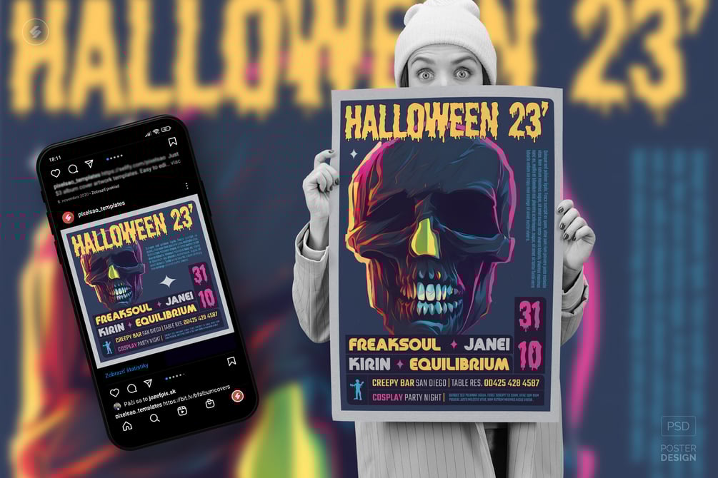 Colorful skull paint, Halloween party flyer, and event poster design. Easy to edit and customize Photoshop PSD template for an electronic music club session, DJ party club night (house music, trance, psytrance, progressive house, drum and bass, dubstep, trap music, etc.), alternative music concert, or various events. Zip files include an A3 poster and a square flyer (which could be used for social media such as Instagram posts).