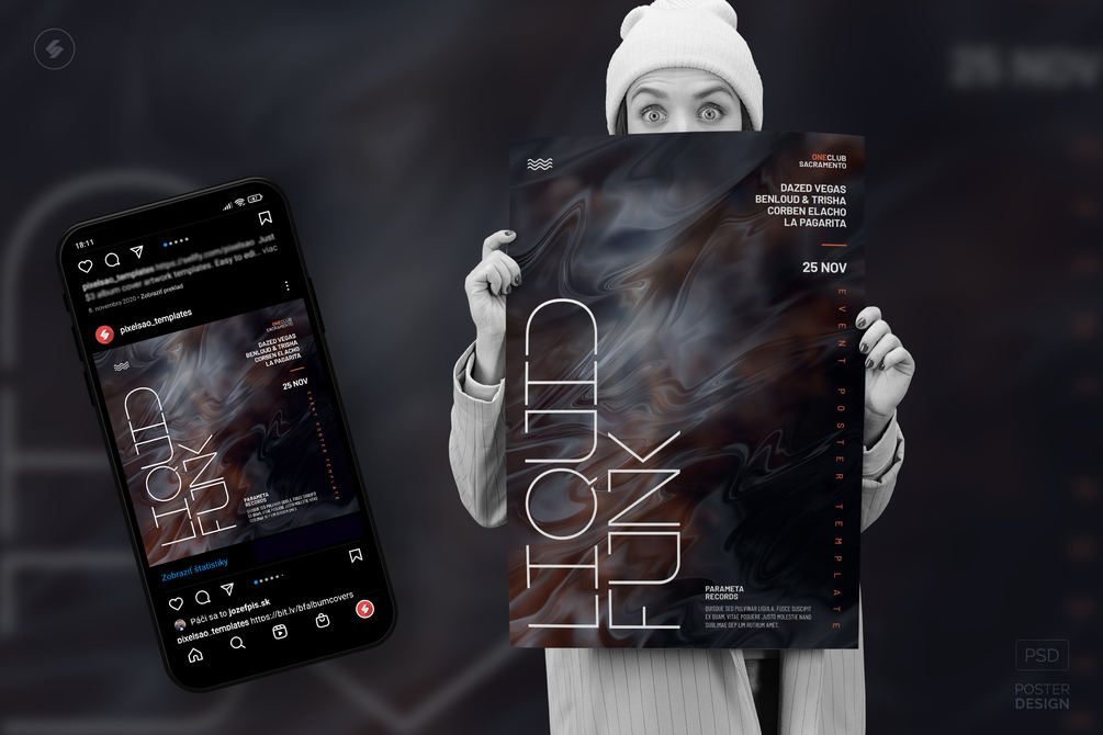 Liquid background creative party flyer, A3 poster artwork template for club music sessions, DJ parties, or various events. Best for music genres such as liquid-funk drum and bass, dubstep, house music, minimal, tech-house, techno, ambient, alternative electronica, etc.