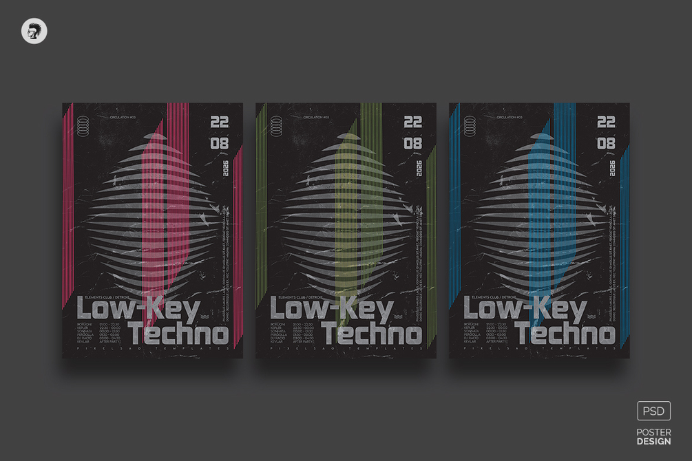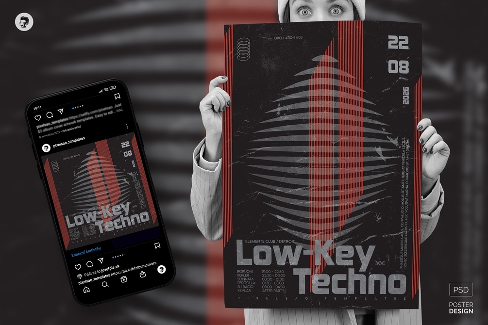 Abstract poster and square techno party flyer design. Customizable Photoshop PSD templates for underground electronic music DJ sessions, club parties ( lowkey tech, techno, tech-house, minimal, drum and bass, dubstep, EDM, electro, house music, progressive house, etc.), or various events.