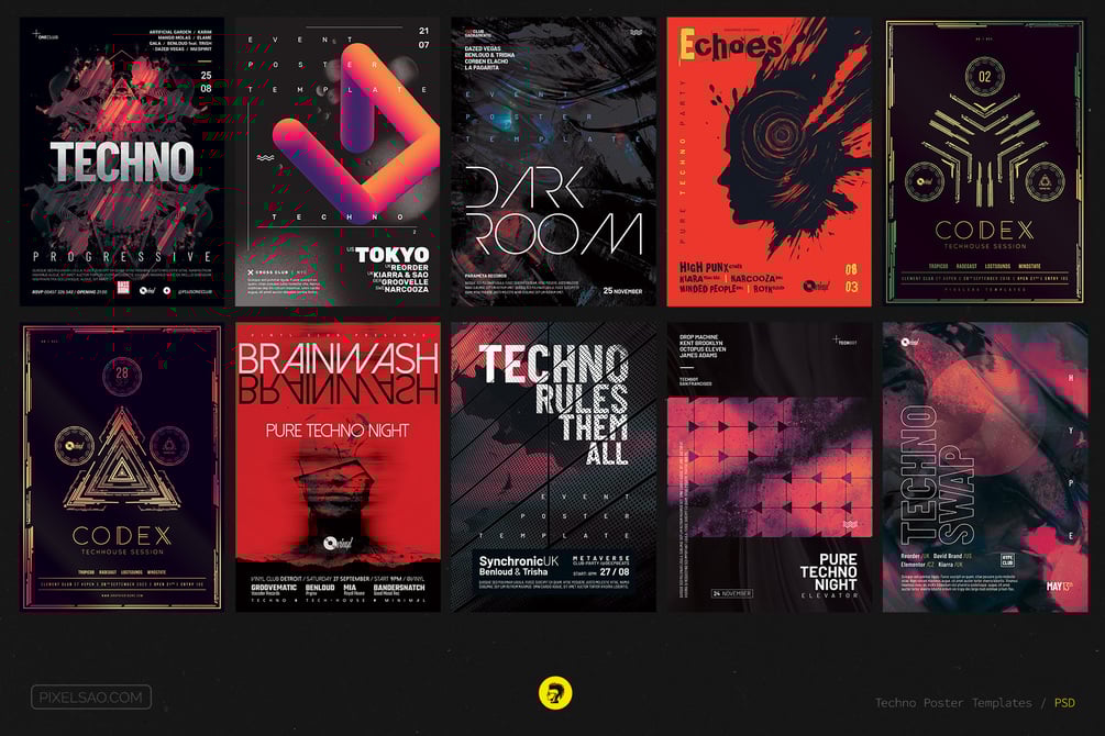 10 creative abstract techno party flyers and event poster designs. Easy to edit and customize Photoshop PSD templates. A3 posters and square flyers for electronic music parties, club DJ sessions, or various events. Best for club dance music genres such as techno, tech house, house music, progressive house, drum and bass, dubstep, electro, alternative electronica, breakbeat, organic house, deep house, minimal, etc.
