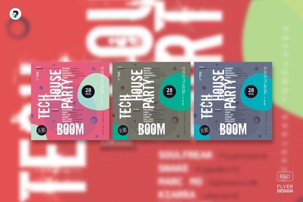 Text-based typographic poster and flyer template. Customizable Photoshop PSD templates for club electronic music DJ parties, sessions, or various events. It fits well for music genres such as house music, techno, tech-house, house music, alternative music, breakbeat, drum and bass, dubstep, dub techno, downtempo, world music, etc.