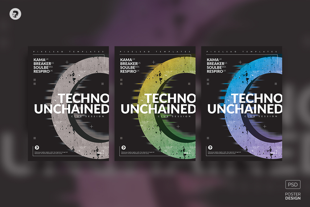 Abstract poster and square flyer design. Customizable Photoshop PSD templates for techno DJ sessions, club parties ( lowkey tech, techno, tech-house, minimal, drum and bass, dubstep, EDM, electro, house music, progressive house, etc.), or various events.
