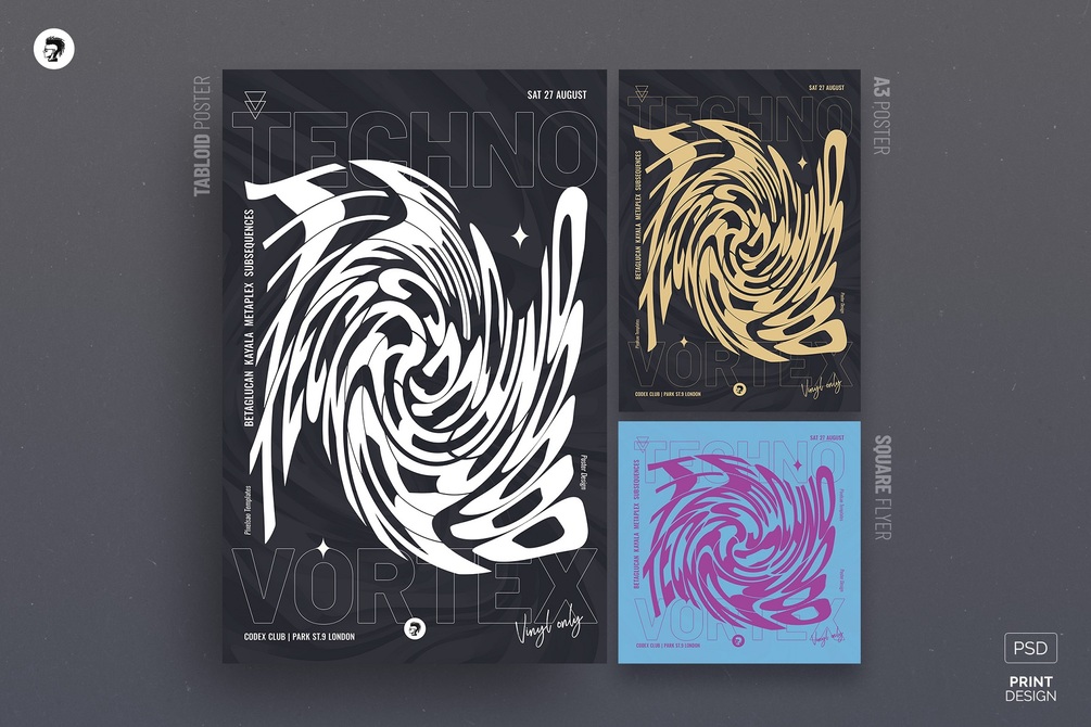 Techno Twirl Party Flyer/Poster PSD Templates Kit – specifications: