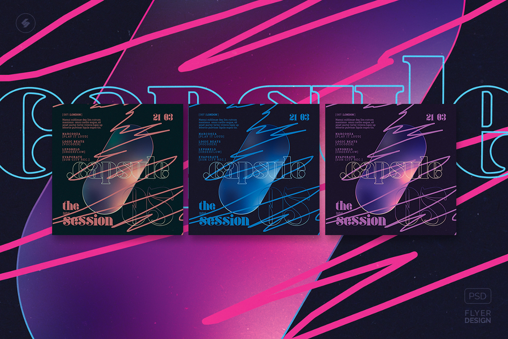 Creative event poster and square party flyer artwork. Club electronic music party flyer and event poster design Photoshop PSD template for various genres of electronic music such as progressive house, electro, dubstep, drum and bass, techno, tech-house, organic house, alternative electronica, deep house, trap music, house music, liquid funk, acid house, trance, experimental music, chillout, ambient, etc.