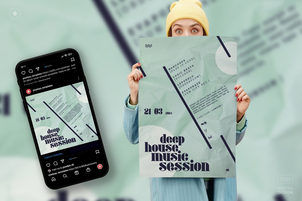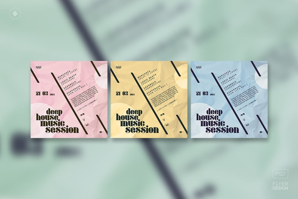 Creative event poster and square party flyer design. Club electronic music party flyer, and event poster design Photoshop PSD template for various genres of electronic music such as techno, minimal, dub techno, tech-house, organic house, alternative electronica, deep house, trap music, house music, liquid funk, drum and bass, dubstep, world music, indie music, experimental music, chillout, ambient, etc.