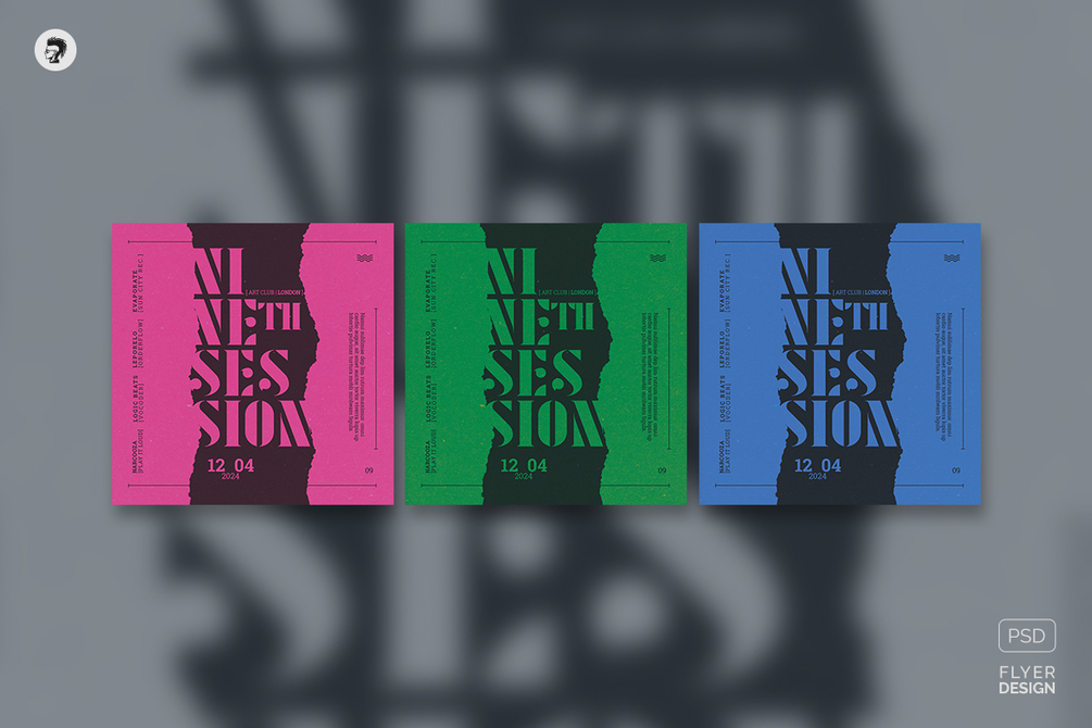 Bold typography, duotone grunge torn-edge paper poster/flyer design. Customizable Photoshop PSD templates for various events, exhibitions, or alternative club music DJ sessions (house music, techno, tech-house, minimal, indie music, alternative music, etc.).
